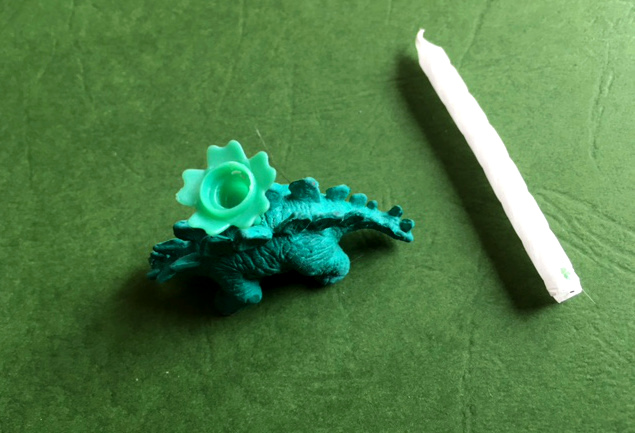- Dann steckt ihr den Stecker für die kleinen Tortenkerzen hinein und gebt die Kerze drauf. Schon ist der Dinokerzenständer fertig 🙂