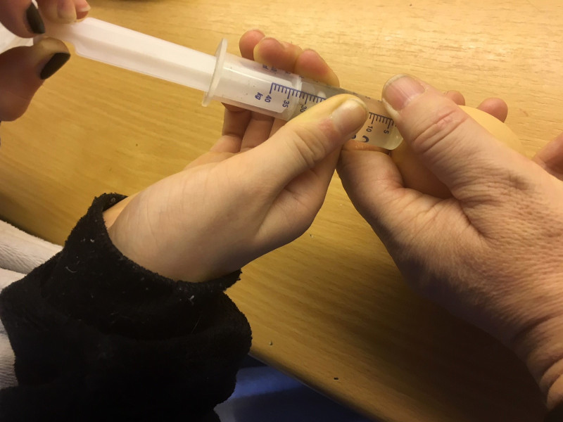 - Dann kann man absaugen, indem man die Spritze aufzieht – das geht einfacher, wenn man zu zweit ist und jemand das Ei hält.