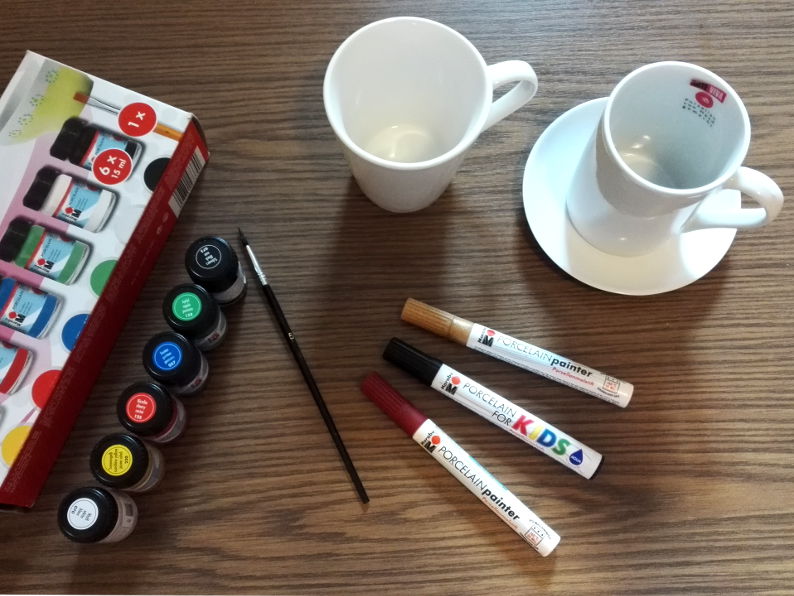- Porzellanmalstifte oder Porzellanmalfarben und Pinsel: Anmerkung – Einfacher ist es, wenn ihr Farben wählt, die nicht eingebrannt werden müssen. Das heißt, sie werden durch eine lange Trockenzeit fixiert und müssen nicht im Backofen eingebrannt werden. Beachtet die Aufschrift der jeweiligen Verpackung, da steht alles genau oben.