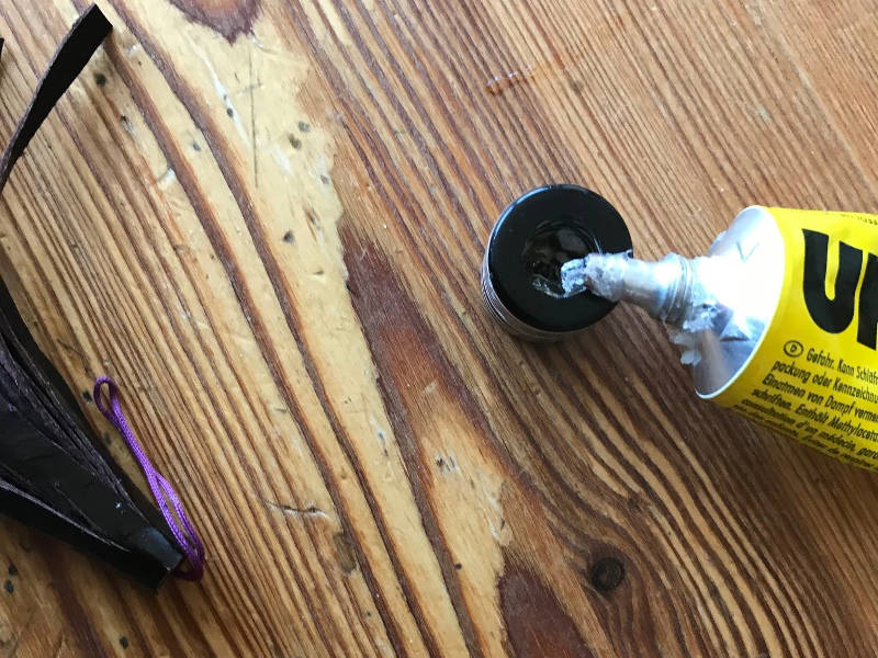- Der Lederstreifen wird in der Folge mit Kleber versehen und zusammengerollt.