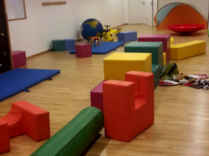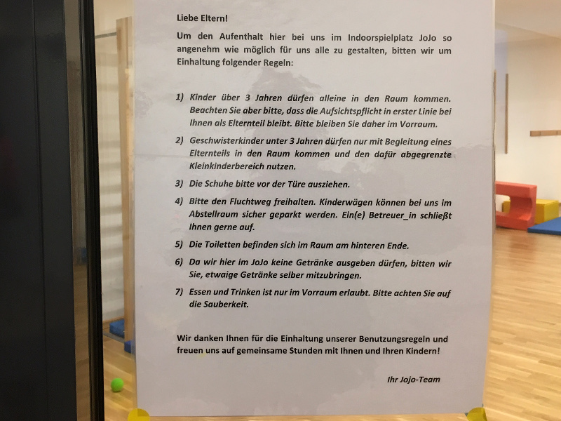Durchsichtige Türen, auf denen die Benutzungsregeln angeschlagen sind, führen in einen wirklich schönen großen Raum mit Tageslicht. Es gibt eine kleine Kletterwand, 2 Sprossenwände, Langbänke, Pölster, eine Strandmuschel, Matten, Bälle und Schaumstoff-Würfel. Alles noch neu und gepflegt und wirklich nett. Außerdem waren 2 ParkbetreuerInnen anwesend, die mit den Kindern gespielt haben.
