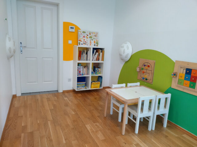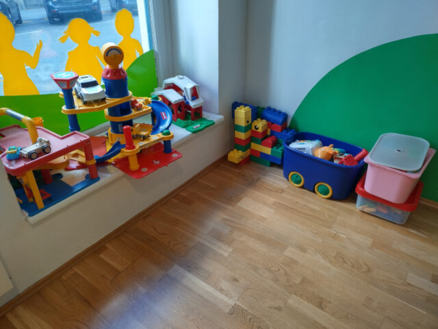 Wenn man reinkommt ist gleich Platz für Kinderwägen und es gibt Haken, wo man die Jacken aufhängen kann. Im „Empfangsraum“ gibt es auch eine große kindgerechte Tischecke.