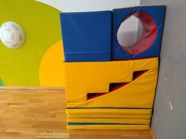 Daneben ist ein Raum mit einem kleinen Bällebad im Eck, in das die Kinder spielerisch über eine Rutsche hinein können. Große Schaumstoff-Spielsteine gibt es auch, diese kann man aufeinander türmen oder sich gemütliche Sitzmöbel daraus bauen. Es ist wirklich sehr geräumig, sodass mehrere Kinder gleichzeitig verschiedenes spielen können.