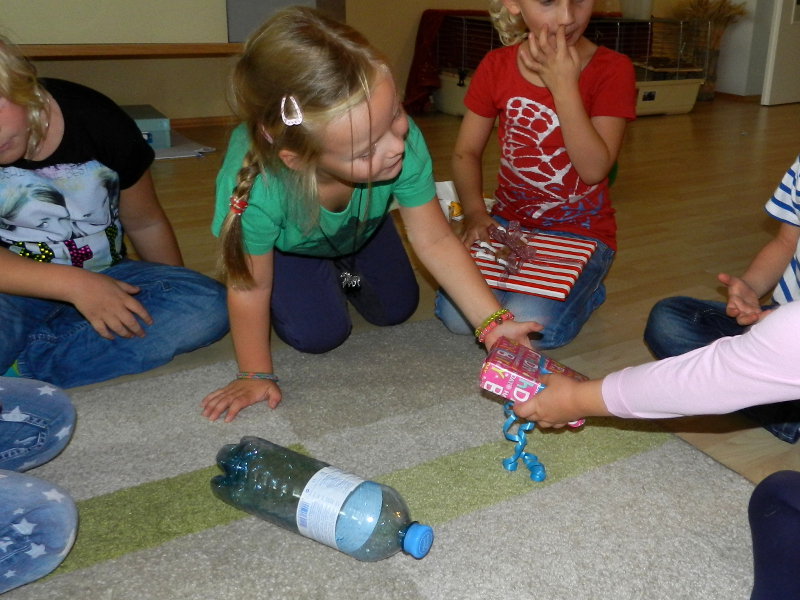 - Geschenke überreichen (hier ist immer das Kind an der Reihe, auf welches die Falsche beim Drehen zeigt) und gemeinsames Auspacken und Ausprobieren