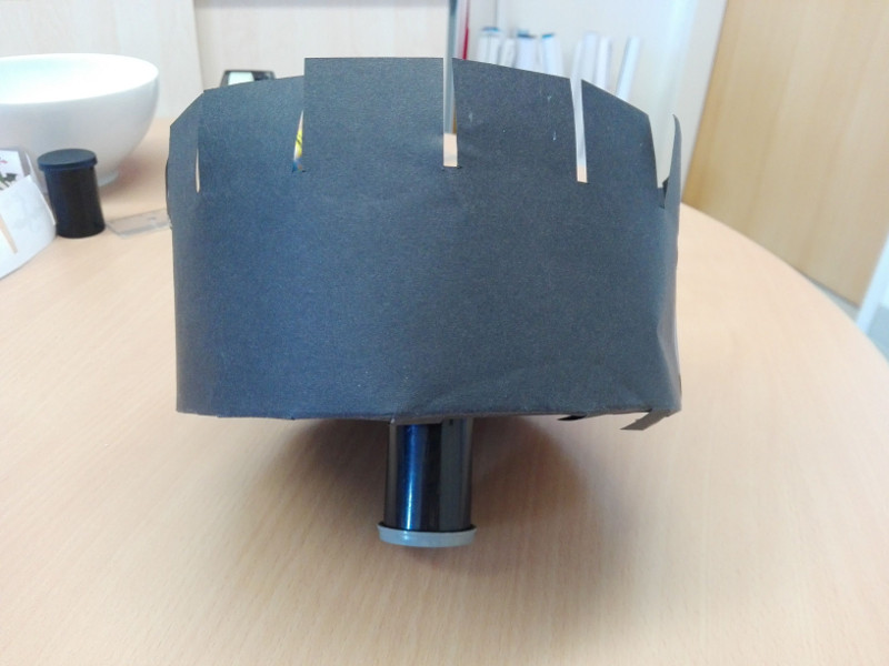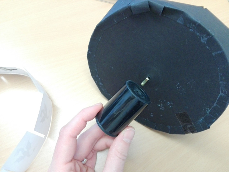 - Wenn ihr das auf beiden Seitenteilen gemacht habt, könnt ihr sie mit den Klebeflächen auf den Boden der Wundertrommel kleben. Am besten klebt ihr sie von unten an den Boden, dann hält es besser. Wichtig ist dabei, dass ihr die beiden Seitenteile so anklebt, dass sich 1 Sehschlitz überlappt. Und dort, wo sich die Wände überlappen, klebt ihr sie mit Klebeband fest.