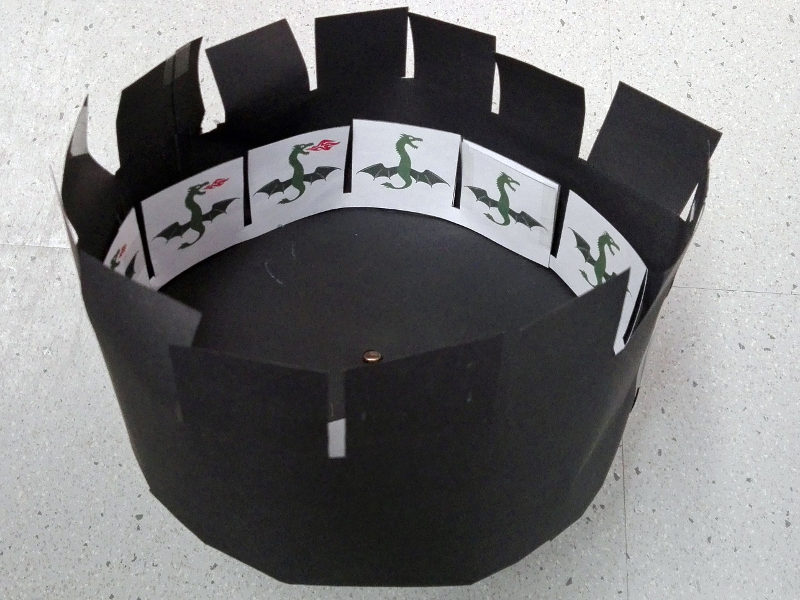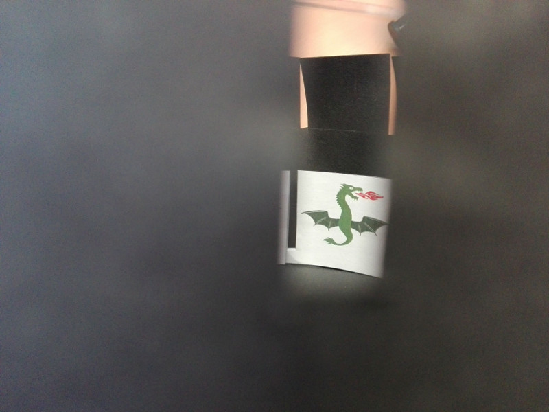 - Wenn ihr den Ring mit den Bildflächen nach innen (!) in die fertige Wundertrommel legt kann die Filmvorstellung beginnen! Mit einer Hand hält ihr die Wundertrommel an der Filmdose oder am Korken fest, mit der andern gebt ihr der Trommel einen leichten Schubs. Gleichzeitig schaut ihr durch einen der Schlitze. Seht ihr, wie der Drache Feuer speit?