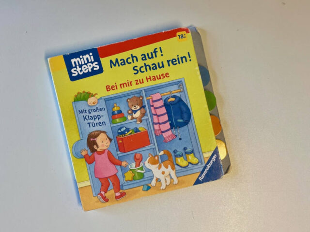 Ein keines stabiles Pappbilderbuch, bei dem man Kästen und Türen öffnen kann um zu entdecken, was es dahinter zu sehen gibt. Vom Zähneputzen im Bad, übers Anziehen bis zum Kochen und Spielen werden Szenen des Alltags beschrieben.