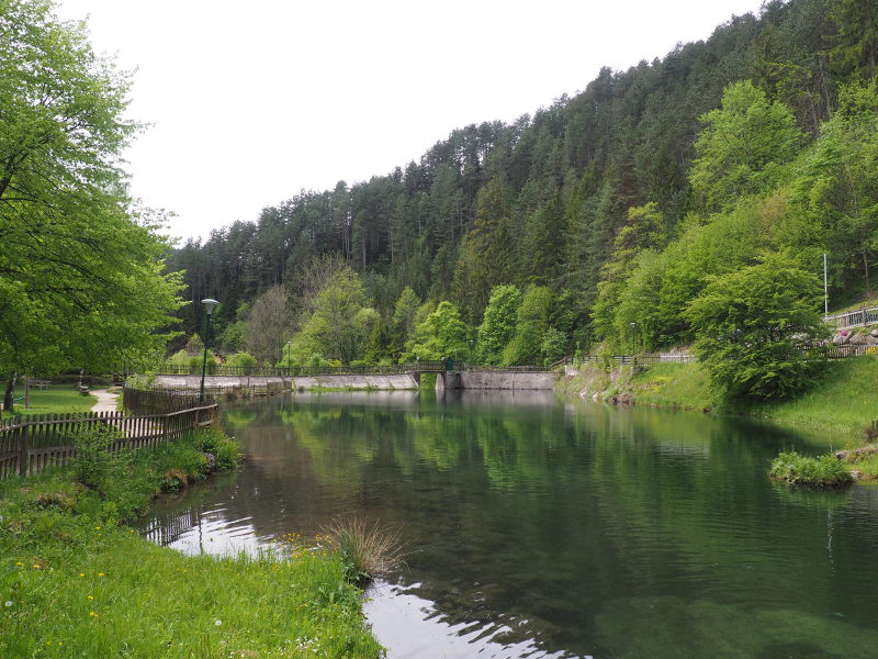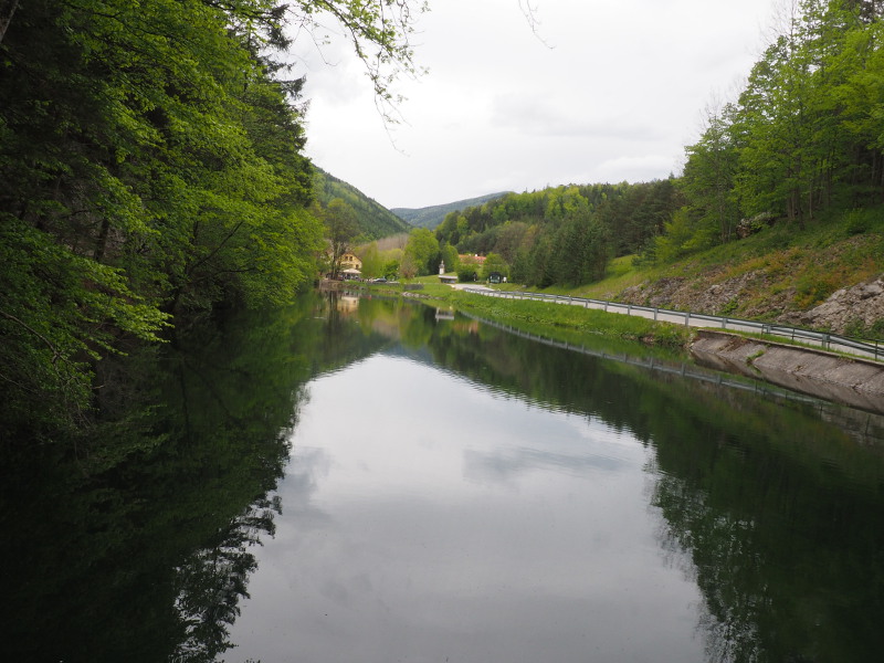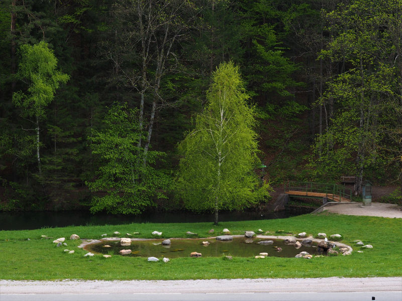 Nach ca. 25 Minuten seit ihr am oberen Ende der Klamm angekommen. Von dort geht es bald flacher durch den Wald und dann am Oberen Stausee entlang. Eine Brücke führt oben über die Myra auf eine Wiese mit einem kleinen Teich, in dem wir schon Kaulquappen und einen Molch gesehen haben. Daneben liegt die Straße, auf der allerdings meist nicht so viel Verkehr ist, sodass man dort herrlich Picknicken und rasten kann. Zudem liegt linker Hand, vor dem Gasthof Karnerwirt ein sehr netter frei zugänglicher Spielplatz. Auf diesem Spielplatz könnt ihr es euch in der Nestschaukel gemütlich machen, die Bolderwand erkunden oder auf der Seilbahn dahinrauschen. Da der Spielplatz direkt neben der Myra liegt, die hier vor dem Staubecken noch nicht so ein reißender Fluss ist, kann man an heißen Tagen auch im Bach die Füße kühlen.