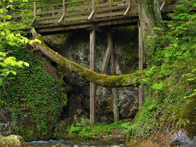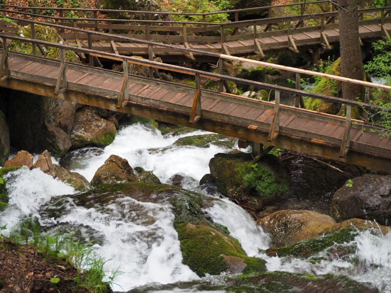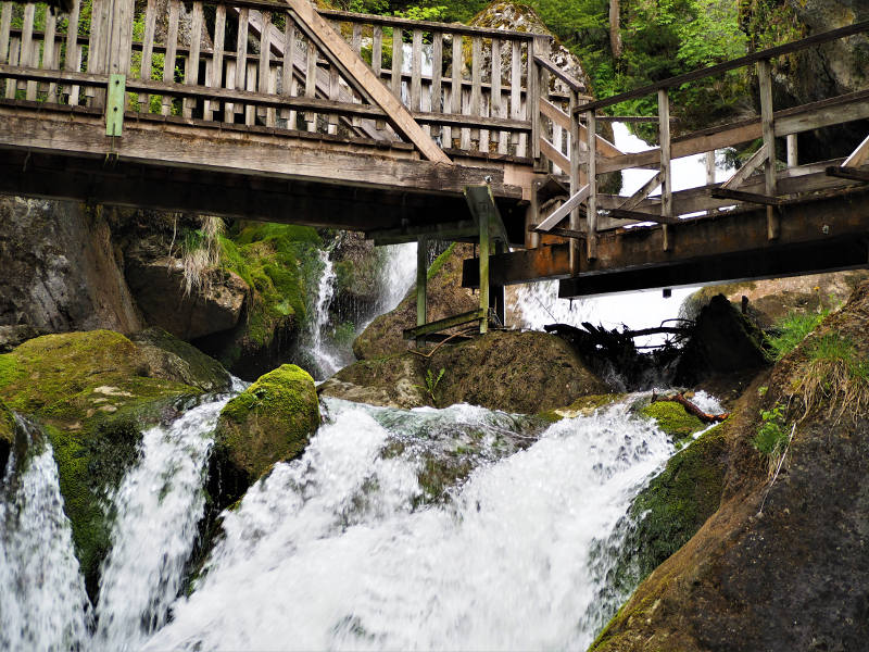 Die Klamm selber ist gut durch Holzbrücken erschlossen, die sich erst einmal recht steil den Hang hinauf direkt über dem Wasser befinden. Das Wasser stürzt über Steine hinunter, sodass es ein gewaltiges Schauspiel und ein ziemliches Getöse ist. Kein Wunder, dass dort einige Mühlen standen, die die Wasserkraft nutzten. Auch an den Überresten eines alten Sägewerks kommt ihr vorbei, sowie weiter oben noch Reste einer alten Straße erhalten sind. Thementafeln geben darüber Auskunft. Insgesamt bieten 11 Themenstationen Einblicke in die Geschichte, Fauna und Flora der Gegend, auch was e mit dem Stauweiher oder dem Wasserschloss auf sich hat, erfahrt ihr da.