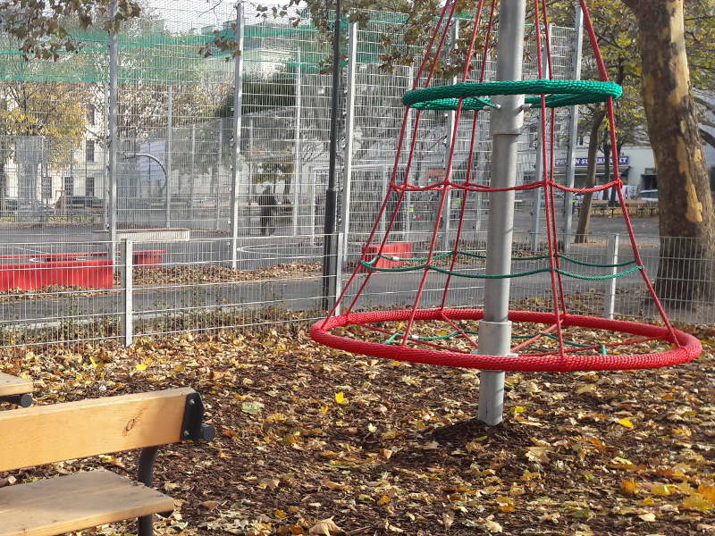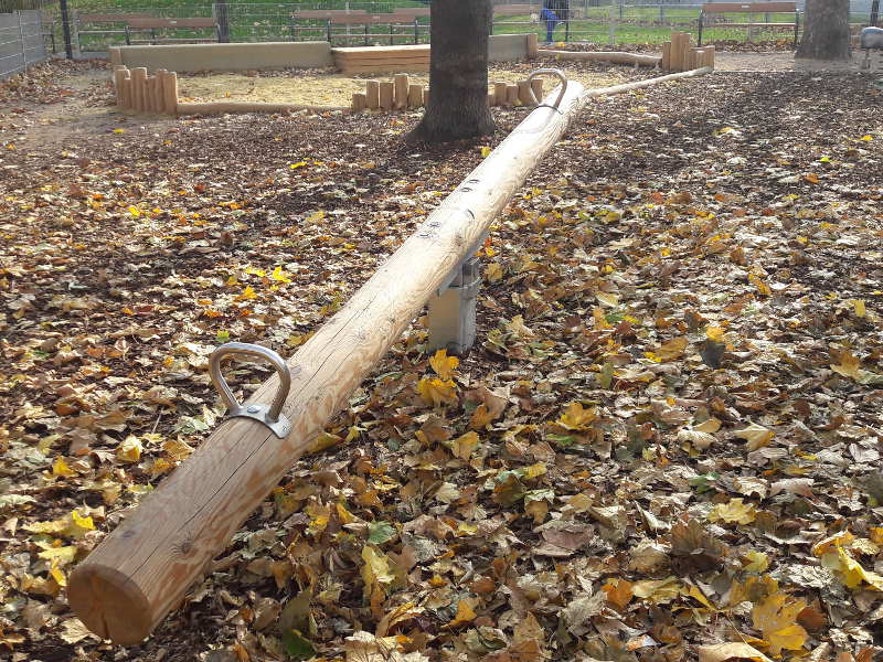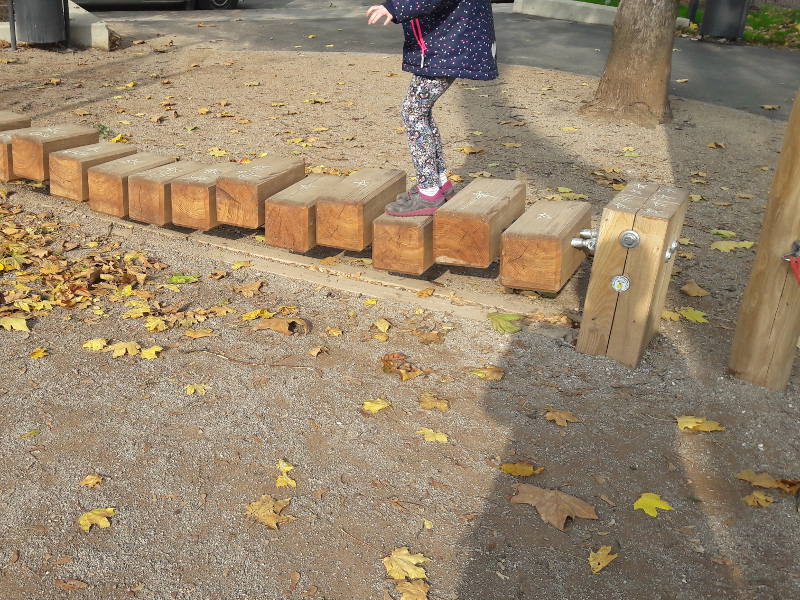 Darüber hinaus gibt es in einem Teil des Parks bunte Punkte am Boden. Kinder nutzen sie für unterschiedliche Hüpfspiele oder als Leo beim Fangenspielen. Meine beiden Mädchen mögen die Slackline und Wackelbrücke besonders gern.