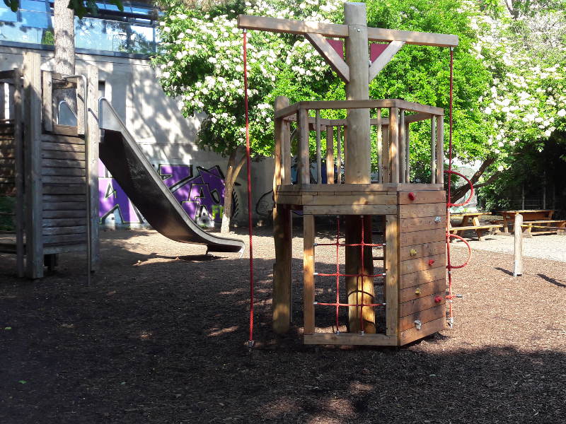 Im dritten Spielbereich, gleich neben dem Eingang, gibt’s mehr Schatten, eine Korbschaukel und weitere Kletteranregungen. Besonders gut hat meinen beiden Kindern (3 & 5 J.) die Rutsche gefallen. Sie ist etwas breiter als üblich und so konnten sie nebeneinander statt hintereinander runtersausen.