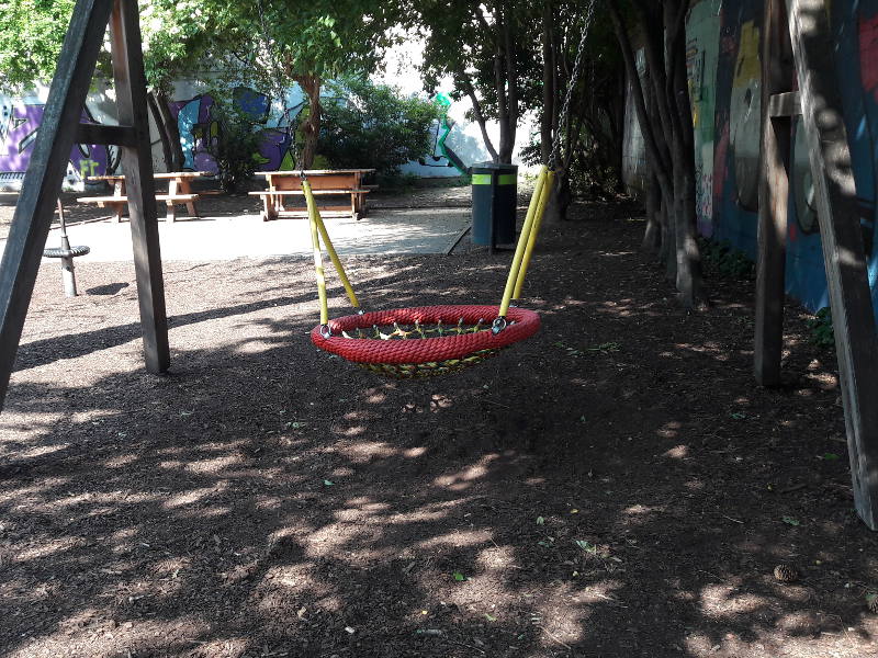 Die Sandkiste ist groß und beschattet. Es gibt auch zwei Kleinkinderschaukeln. Der gesamte Spielbereich ist eingezäunt und die Tür hat einen zusätzlichen Riegel, damit die kleinen Entdecker_innen nicht so leicht ungesehen entfleuchen können.