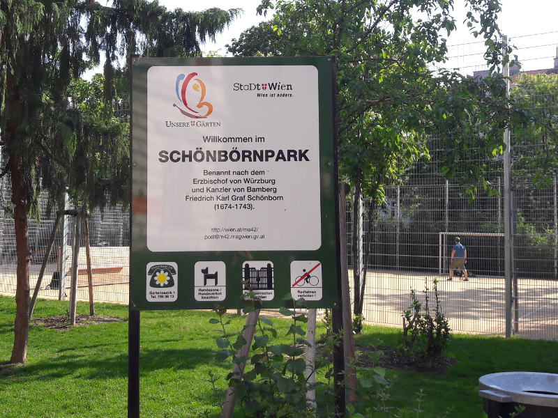 Gleich beim Eingang befindet sich das WC. Nachdem der Schönbornpark mitten im 8. Bezirk liegt, ist er öffentlich gut erreichbar und ein Nahversorger befindet sich auch ums Eck. Hunde sind im Park verboten. Dafür gibt es gleich anschließend einen Hundebereich.
