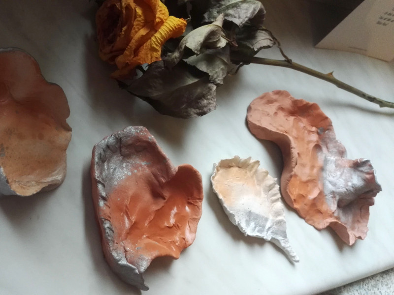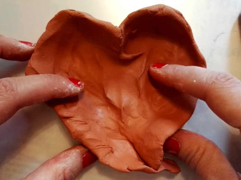 • Der Ton wird vor allem an den Rändern nach einiger Zeit anfangen zu trocknen (ist Ton der an der Luft trocknet!). Wenn ihr mit der Form oder dem Muster nicht zufrieden seid, einfach etwas Wasser nehmen und den Ton anfeuchten. Dann kann man ihn wieder bearbeiten.