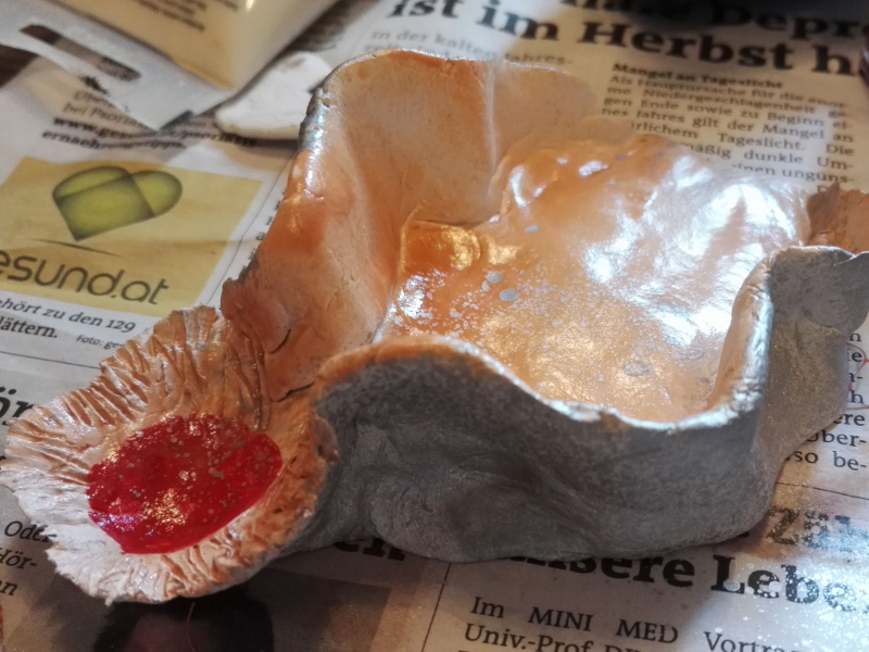 Wenn ihr mit eurem handgemachten Kunstwerk fertig seid, an einen sicheren Ort stellen, wo keine Kinderhände hinkommen und dort trocknen lassen. Je nachdem wie dick und groß das Stück ist, kann es auch schon mal ein paar Tage zum Trocknen brauchen!