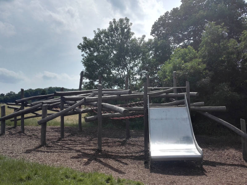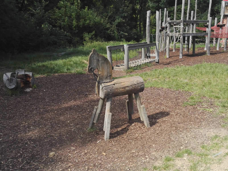 Über sehr hohe Holzpfosten kann man zu einem Kletternetz gelangen, in dem man sich auch mal hinlegen kann. Weitere Wackelstege und Balancierseile führen zu einem hohen Baumhaus, von dem eine Rutsche weggeht. Nichts für schwache Nerven! Wem die Höhe und das Klettern zu viel wird, kann einfach mal in der Korbschaukel verweilen.