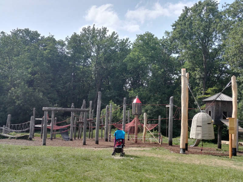 Kleinere Kinder können durch hohle Baumstämme kriechen und diese von innen entdecken. Wer lieber klettern möchte, kann ein beeindruckendes Klettergerüst erklimmen und eine breite Minirutsche hinuntersausen. Das funktioniert ganz super auch zu zweit mit Mama, Papa oder Freund_innen! 😉 Wenn einen dann doch einmal die Müdigkeit vom Klettern einholt, können die Kinder in den Holzhäuschen „hausen“ und die Jause verspeisen. Außerdem gibt es geschnitzte Holztiere zum „Reiten“. Neulich habe ich auch eine Art „Bienenunterschlupf“ gesehen, in das man hineinkrabbeln kann – Bienen gab es natürlich keine.