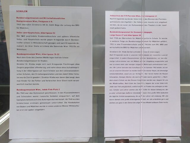 Das Bezirksmuseum Josefstadt befindet sich in der Schmidgasse 18. Im Untergeschoss ist noch bis 25.01.2026 die Sonderausstellung Zwischen Trümmern und Neubeginn zu sehen, welche einen Einblick in die Josefstadt von 1945 bis 1955 bietet. Gegenstände wie Soldatenhelme, die ersten Umlaufmünzen der 2. Republik, ein Bildschirm mit Werbespots sowie Werbeplakate, Zeitungsartikel usw sind hier ausgestellt.