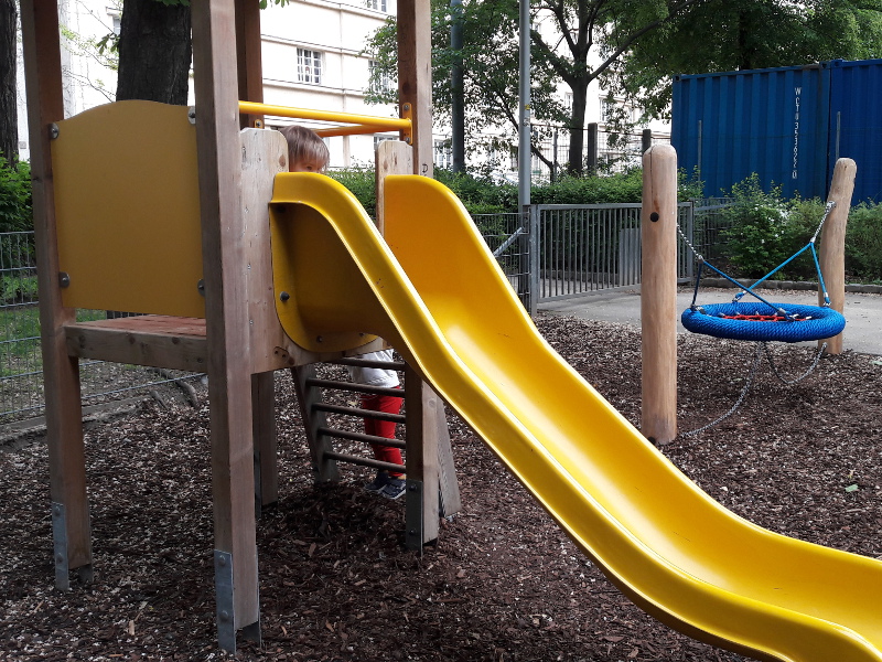 Es gibt Abenteuerspielplätze, Wald– und Wasserspielplätze, Motorikparks und Spielplätze für gestresste Eltern. Der Bereich für die Kleinen beim Rudolf-Sallinger-Park ist unser Spielplatz, wenn ich ein bisschen geschlaucht bin und trotzdem mit den beiden Lausern raus möchte.
